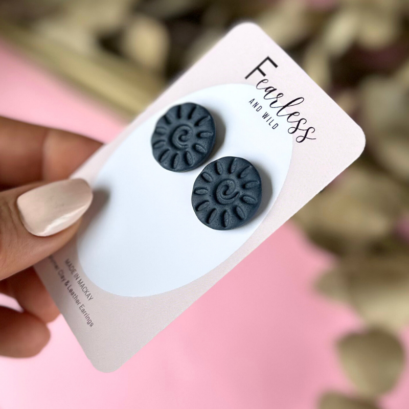 The Navy Alexia Stud is the perfect blend of bold and playful. Handmade from clay, these statement studs are just the right size for those who love an eye-catching yet effortless look. With a unique pattern and versatile design, they’re perfect for elevating any outfit—day or night.