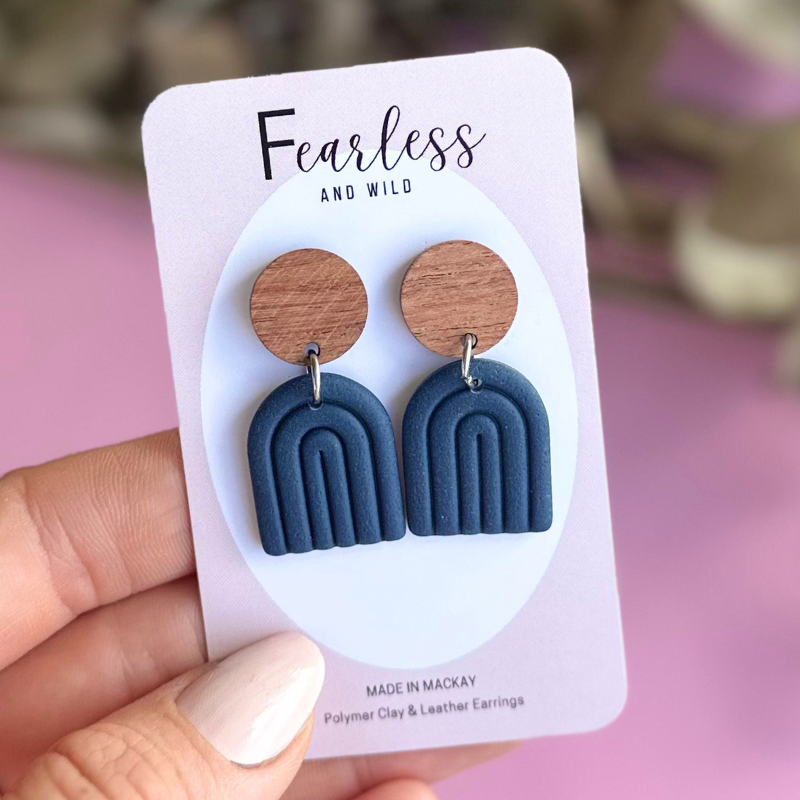 Introducing Athena Mini Navy, a modern arch dangle paired with a wooden top that is simple and versatile and will elevate your style to new heights. These handmade Navy earrings are a must this season. Pair her with your matching outfit or keep it simple to make her pop.