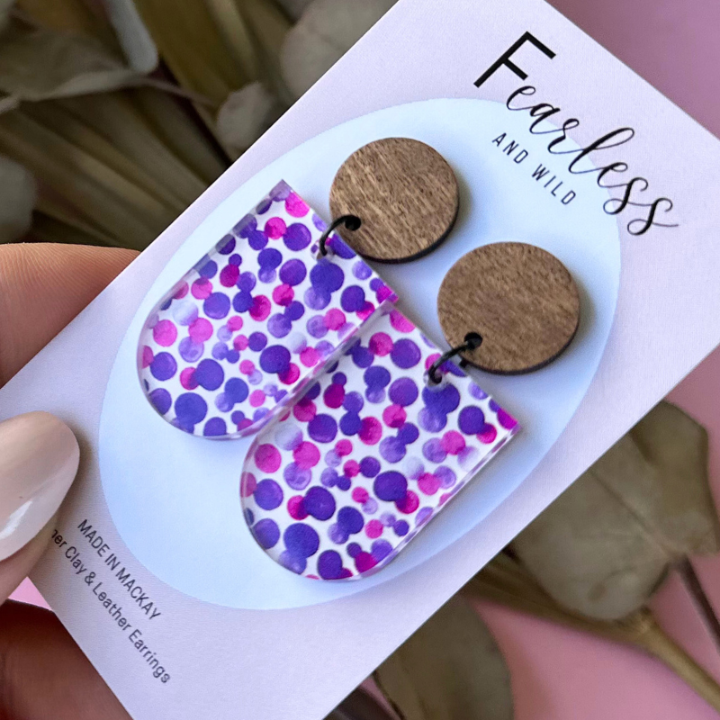 Avah is our small-to-mid sized acrylic design featuring a playful bubble effect in vibrant pink and purple. With its unique geometric shape and eye-catching tones, this piece is perfect for adding a bold pop of colour to any outfit—effortlessly turning everyday looks into standout moments.