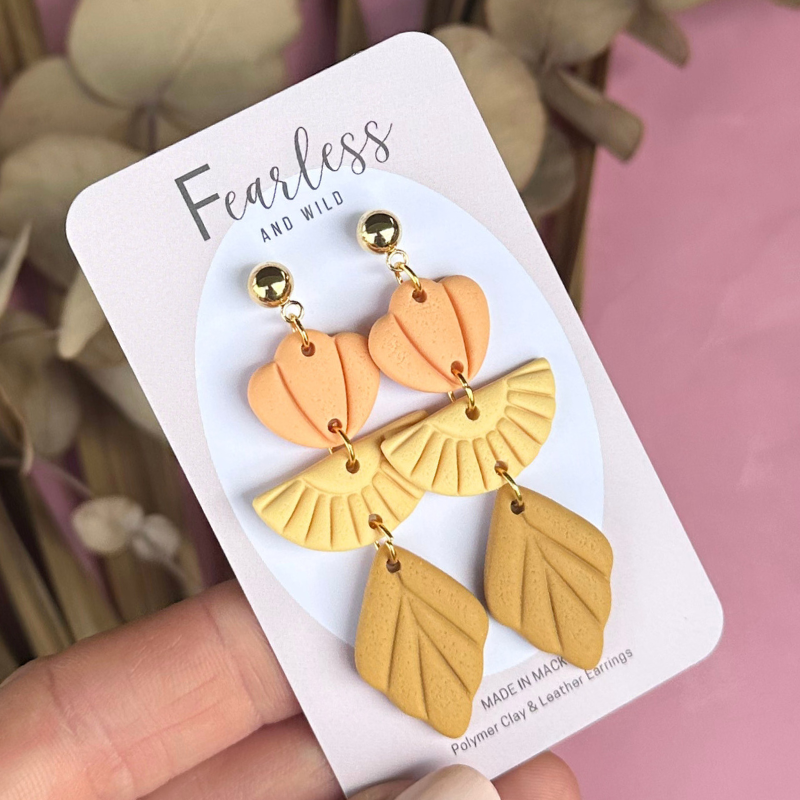 Step into retro vibes with the Dahlia Goldie earrings. With her bold, sweeping curves and vintage-inspired style, these mid-to-large earrings bring the ultimate swing factor to any outfit. Lightweight, easy to wear, and handmade in yellow, peach and mustard tones, they’re effortlessly fun and stylish.
