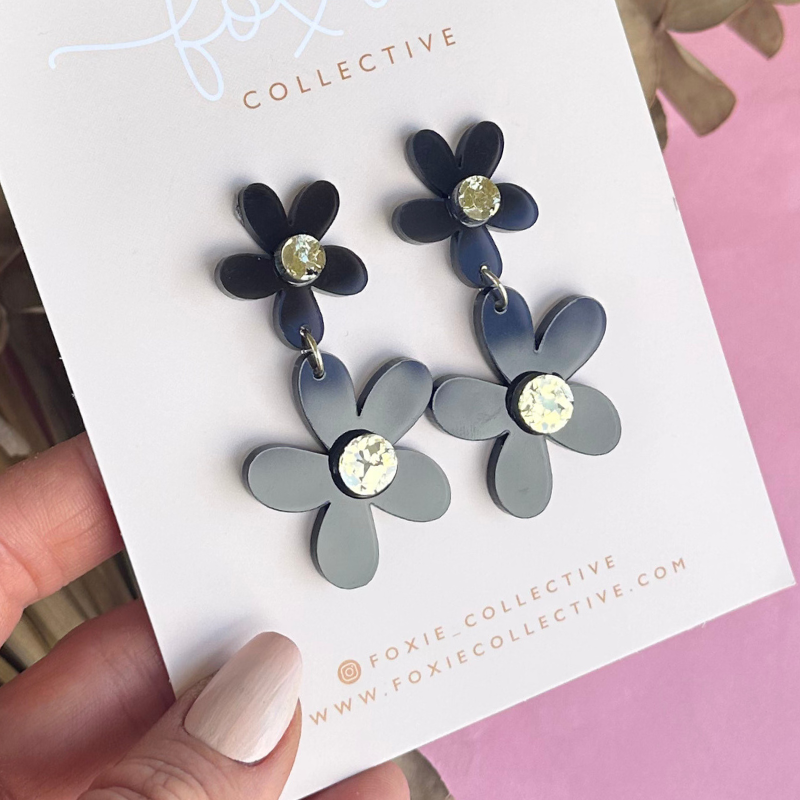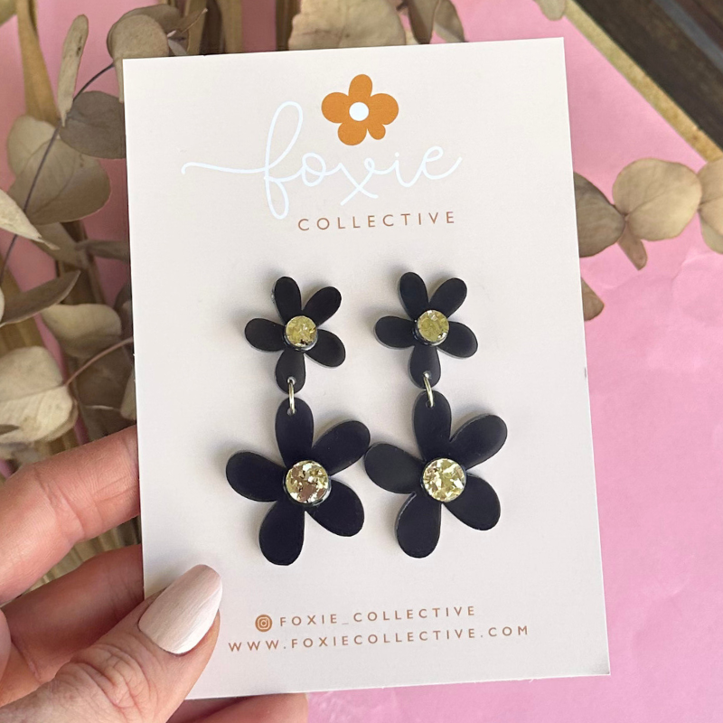 Lightweight floral statement studs you’ll actually forget you’re wearing. Hand-drawn design in matte black with a touch of gold sparkle, finished on hypoallergenic surgical steel studs (yay for sensitive ears).