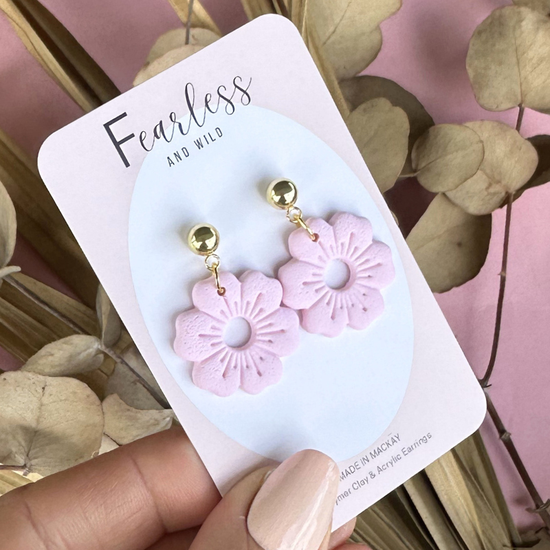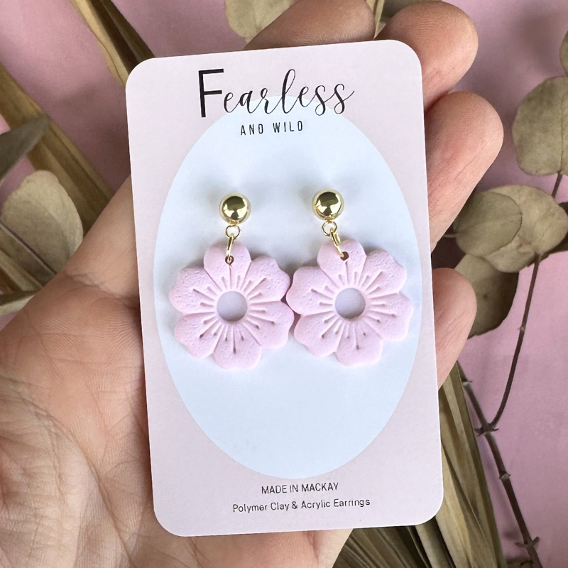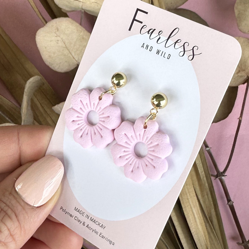Meet Edwina Misty Rose! This beloved mini flower dangle shines in a light pink for an effortlessly elegant look. Petite, lightweight, and easy to wear, these handmade clay earrings feature a delicate pink flower paired with a gold-plated stainless steel ball stud—perfect for adding a timeless touch to your day.
