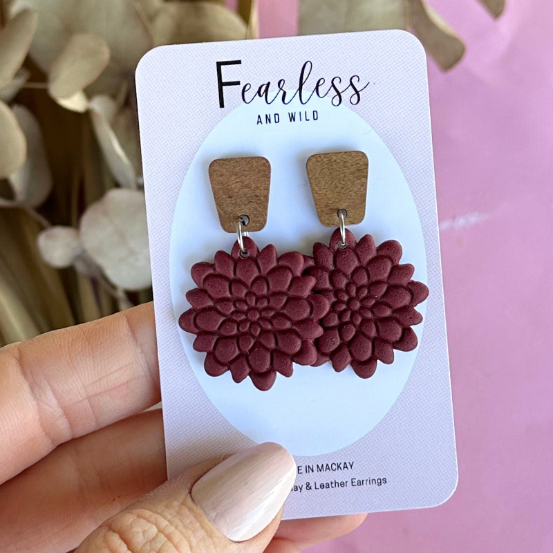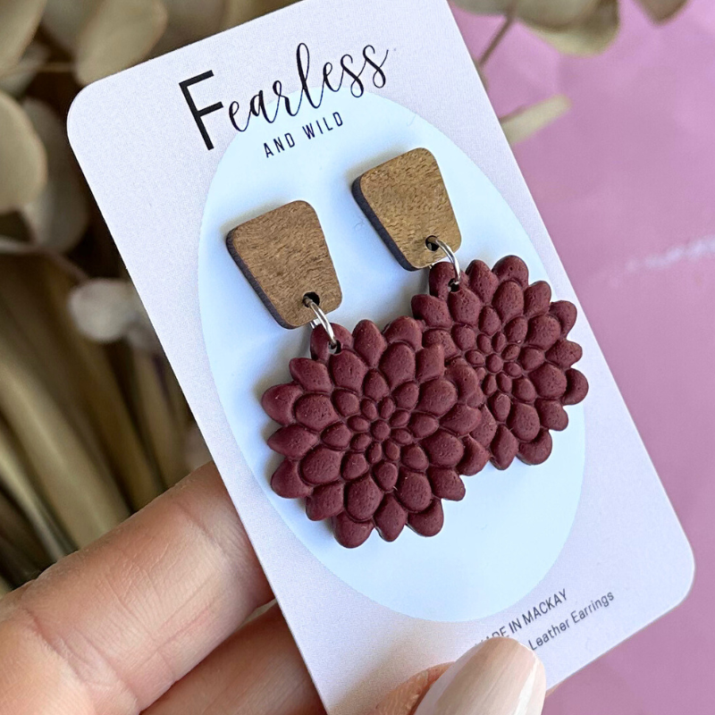Fifi Burgundy is for a earrings for those that love a feminine style but without being to much outside of the comfort zone. Finished in a rich Burgundy with a timber top, she is sure to compliment many outfits this spring.