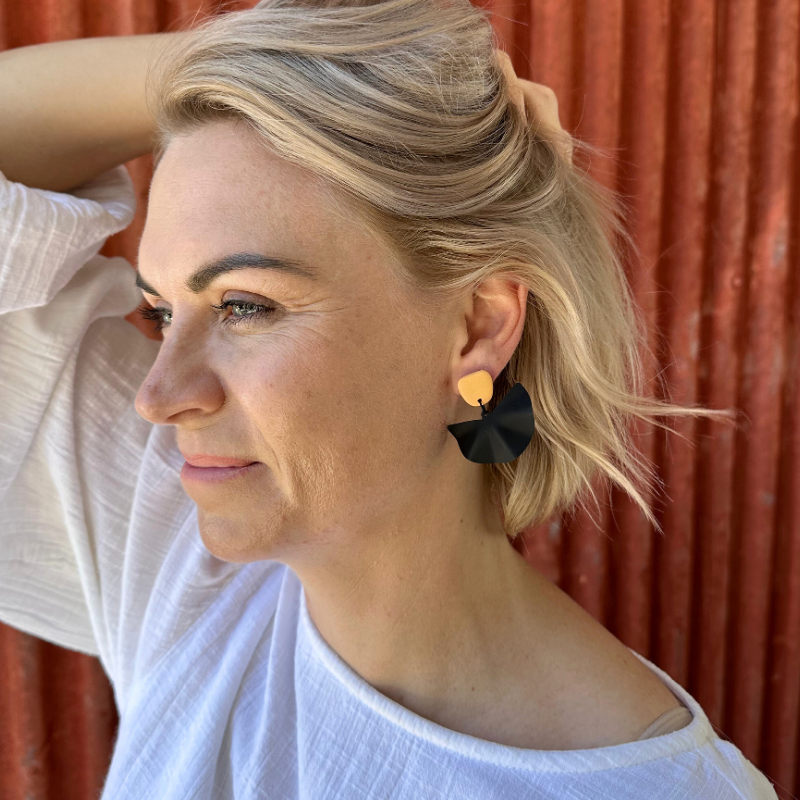 Introducing Gina Black, a stunning new design that seamlessly blends clay and metal into one design. With her elegant wave shape, these handcrafted earrings exude effortless sophistication, taking you from office to drinks with ease.