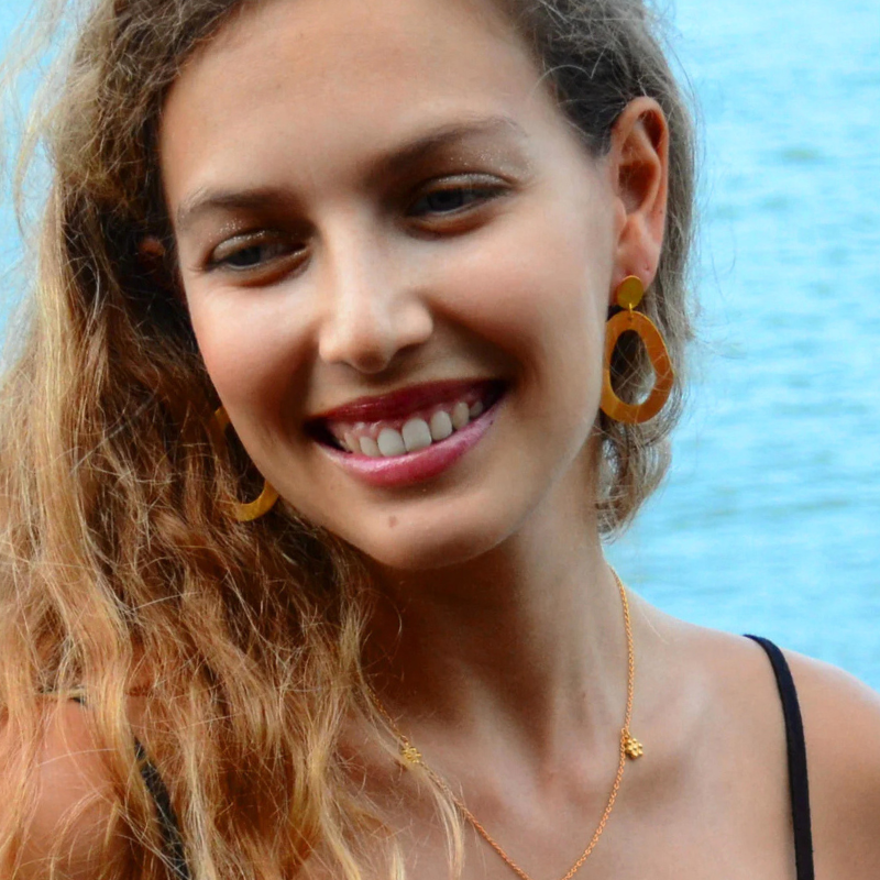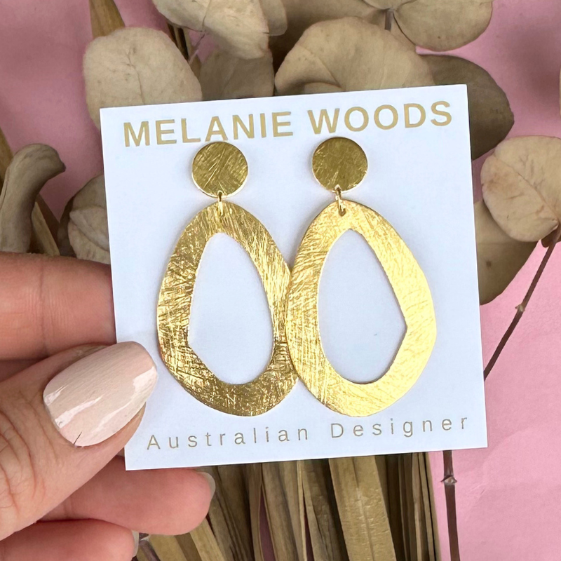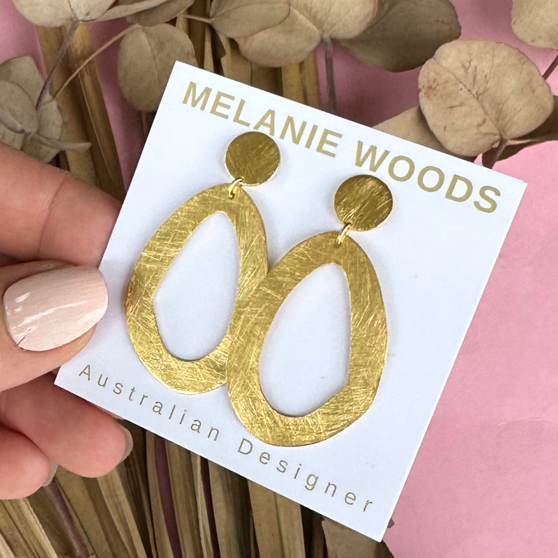 Designed by Australian jewellery designer Melanie Woods, the Gold Organic Drop Earrings feature a beautifully fluid, organic circular shape crafted in classic 24 carat gold on brass with a soft brushed finish. Mid-length, lightweight, and non-allergenic, they offer effortless elegance and add a subtle, timeless shimmer to any special occasion