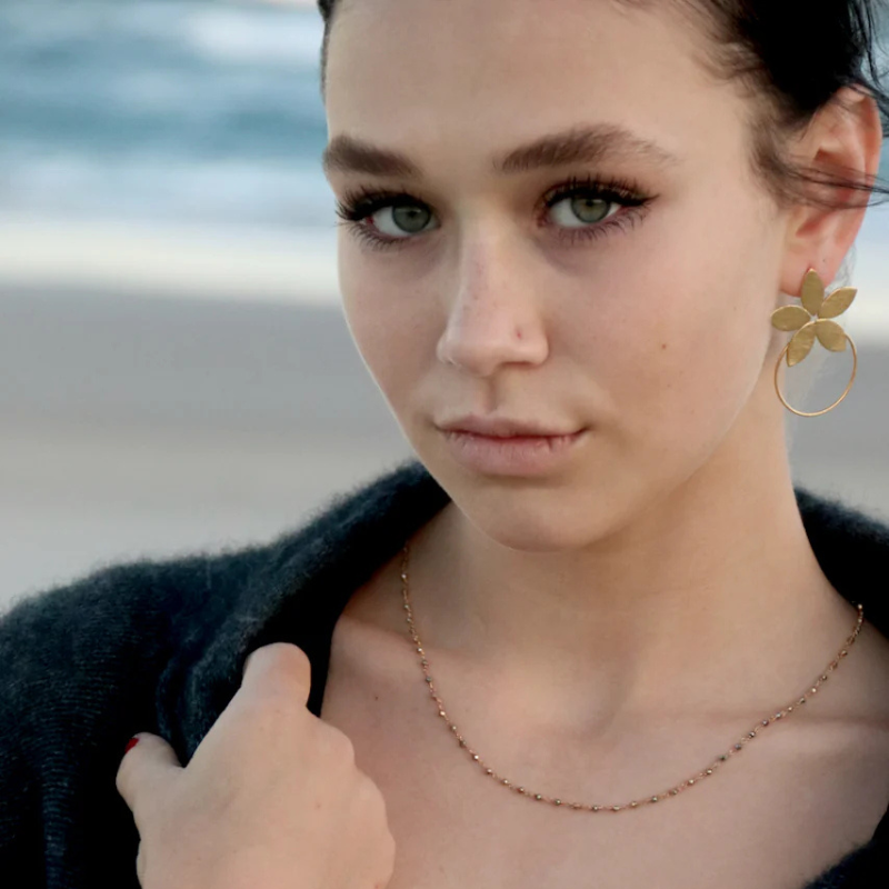Designed by Australian jewellery designer Melanie Woods, the Gold Piccolo Flower Drops Earrings feature 24-carat Gold on Brass with a stunning brushed finish. Lightweight, non-allergenic, and effortlessly stylish, they add timeless shimmer to any special occasion.