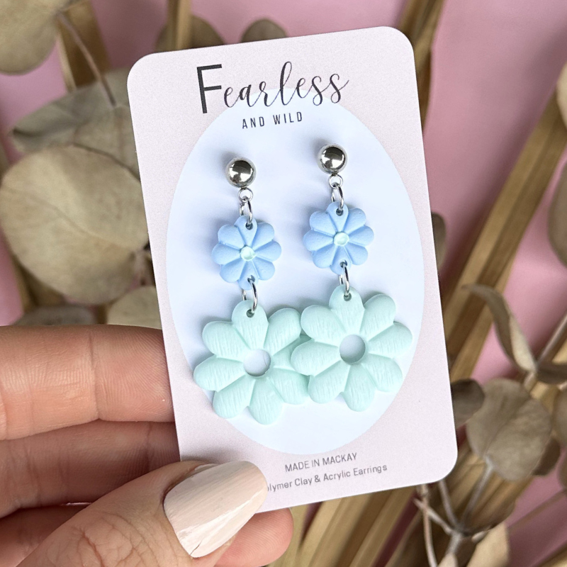 Meet Joni Mint; a beloved mint and blue flower dangle in soft tones for an effortlessly elegant look. Lightweight and easy to wear, these handmade clay earrings feature a delicate bloom paired with a stainless steel ball stud, perfect for adding a subtle pop of colour to your day.