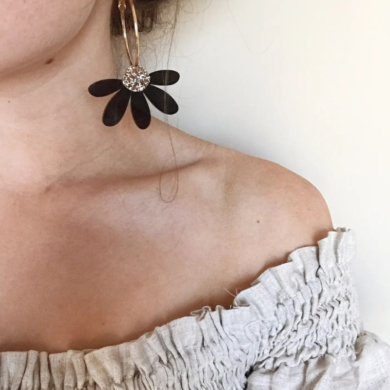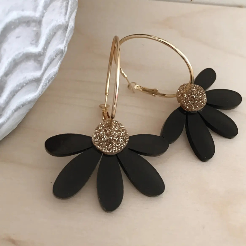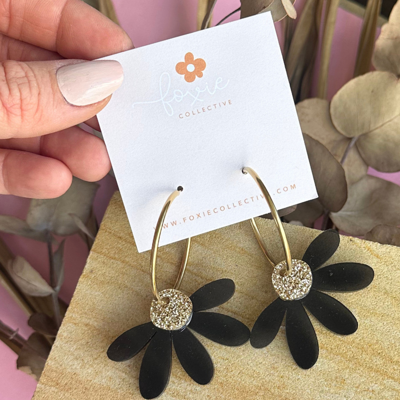 Big, bold and blooming. These jumbo daisy hoops are lightweight enough for all-day wear but still bring serious statement vibes. Hand-drawn petals in black with a pop of gold glitter, finished on shiny gold hoops. The kind of acrylic earrings that make every outfit feel a little sunnier.