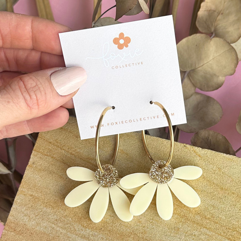 Big, bold and blooming. These Cream jumbo daisy hoops are lightweight enough for all-day wear but still bring serious statement vibes. Hand-drawn petals in translucent Cream with a pop of gold glitter, finished on shiny gold hoops. The kind of acrylic earrings that make every outfit feel a little sunnier.