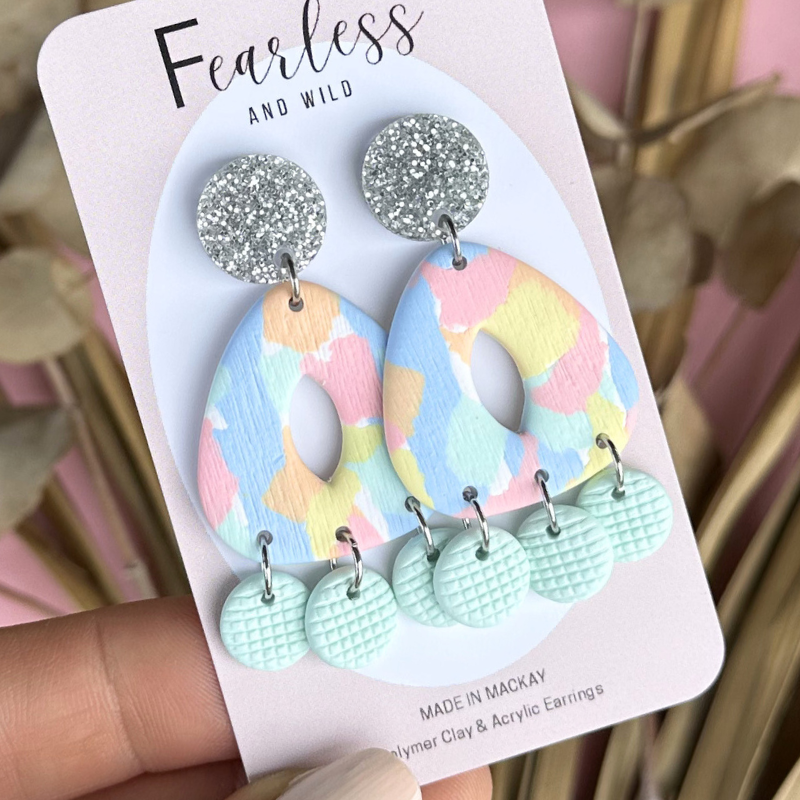 Looking for some flirty fun this year? Nora Pastel is a new design with major swing factor. These handmade clay earrings are playful, bold and perfect for those that love a statement. Finished in fun pastel colours finished with an acrylic sparkle top.