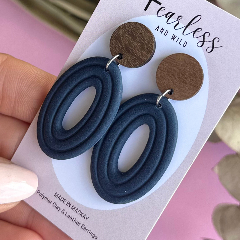 Riley is all things amazing, her curves, her quirkiness, her cuteness, it just works. This beautiful navy clay is finished with a subtle silver glitter through it to give it that lift from drab to fab. She is sure to have people talking about your earrings on the daily!