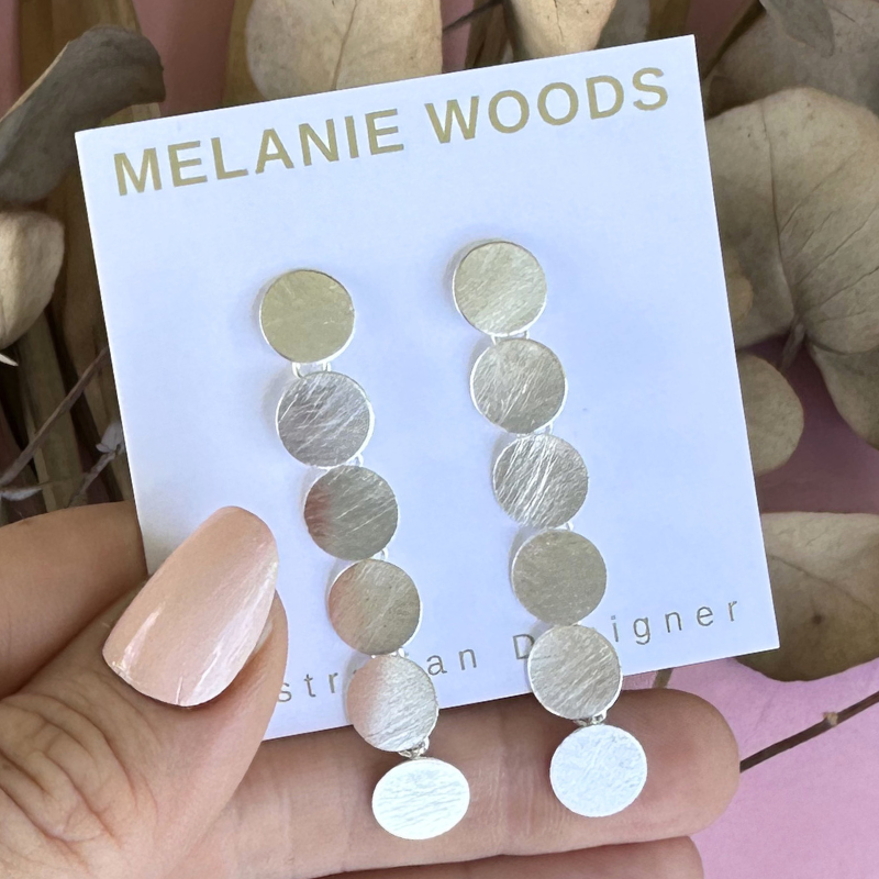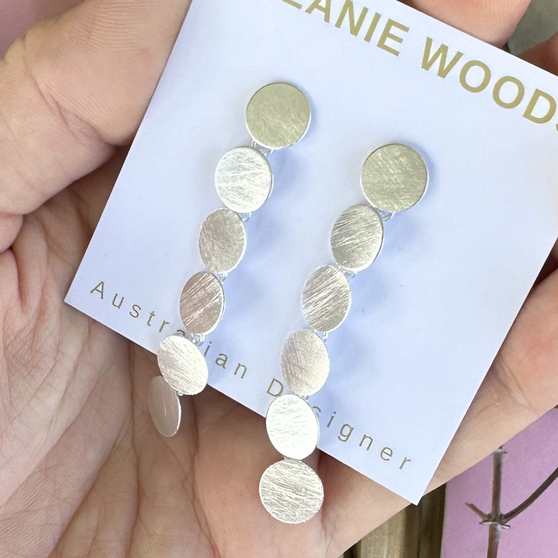 Designed by Australian jewellery designer Melanie Woods, the Silver Wash Motif Long Drop Earrings feature fluid, sculptural curves in pure silver washed plated brushed brass. Lightweight and hypoallergenic, they offer a modern yet timeless elegance for any occasion.