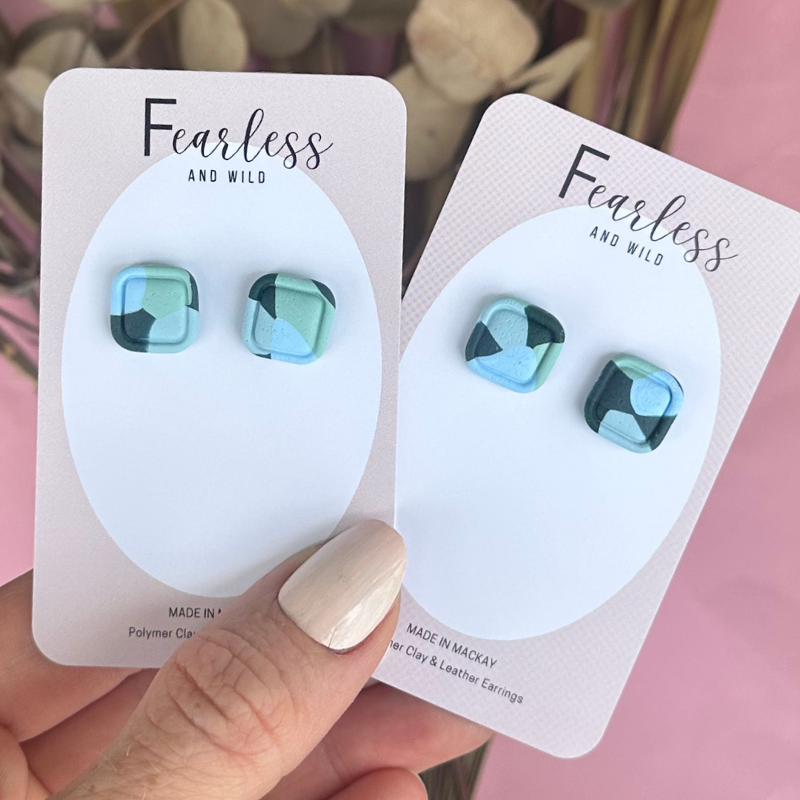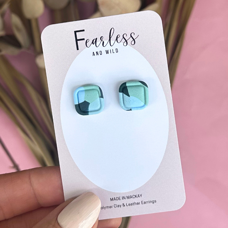 If you love studs than you are bound to love the Square Bluegrass Stud. These handmade unique studs are super cute and bound to brighten your day with their blue, green and sage mix.